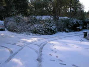 The second morning dawned blue and pink, and we had sun on snow that had been whipped into peaks like frosting by the dogs’ running and wrestling. They played for hours, seemingly unaware that it was 25 degrees. The front-yard snow lay perfectly smooth, except for bird tracks, like tiny quotation marks. The driveway still showed the tire-tracks from our brave newspaper carrier and my footprints to the mailbox—which was frozen shut.