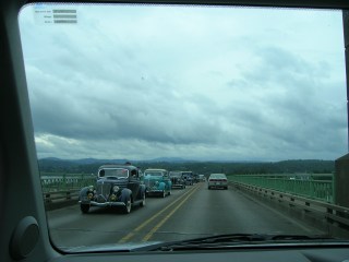 It all crescendoed in yesterday’s festivities. First, everyone was invited to walk across the bridge at noon. The Newport High School Marching Band led the way, followed by pedestrians, a fleet of 1930s-vintage vehicles, and bicycles. Some folks dressed ‘30s-style while most put on their fleece and slickers. Rain was coming. Fortunately, it held off until the bridge had been crossed.