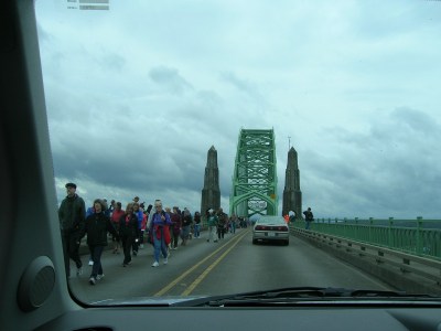 Yesterday, Sunday, Oct. 3, the scene on the bridge was different. The people of Newport and surrounding towns turned out en masse—and on foot—to celebrate the bridge’s 75th anniversary. Our art deco masterpiece opened in 1936, part of a chain of bridges by architect Conde McCullough that finally provided a way for people to drive the Oregon Coast without having take a ferry across the waterways.