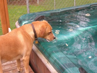 None of this bothers my dog Annie too much. Occasionally she takes a chew off the ragged end of one of the fallen branches near the fence or laps up water from the uncovered spa (blown-off cover still lying on the lawn). Now full of rain water, it’s the world’s biggest water bowl. Yesterday we had a short break from the rain. After some running around and chasing a bumblebee, she sat on the deck for the longest time, staring at the robins pulling worms out of the lawn. Now she’s curled up in front of the pellet stove again.