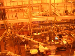 We headed up the stairs to the viewing area where we could watch men and women in white clothes and hairnets turning 40-pound blocks of cheese into one- and two-pound loafs. What would it be like to do that all day with people watching, we wondered. As a computer kiosk babbled about sending “cheesemail” to one’s friends, we checked out the displays that described how they make their cheese and ice cream.