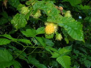 | The salmonberries, cousin to the blackberry, are fruiting. |