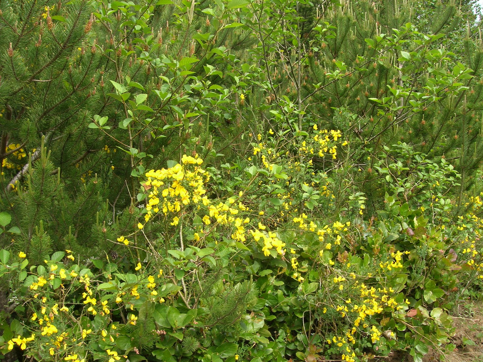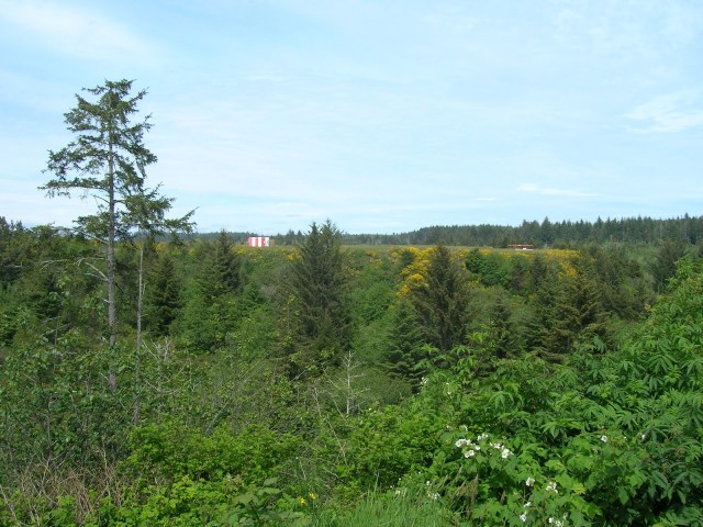 | Across a ravine filled with blackberries, Scotch Broom, spruce, pines and alders, we can see the Newport Airport. |