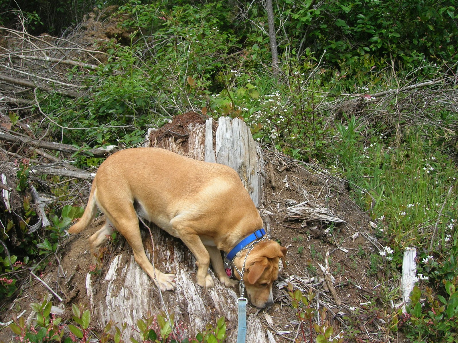 | Annie will stop at nothing to get a close look at something that smells interesting on our walks. This was a good one. |