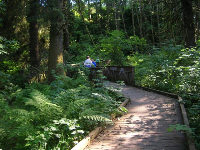 Uh no. This was not that kind of walk. This was serious exercise. The group started fast and never slowed down. We walked this amazing trail I didn’t know existed. It runs from the east side of the Agate Beach parking lot through the woods to the Big Creek reservoir. The tree-shaded trail is partly paved and includes numerous wooden bridges over wetlands full of ferns and enormous skunk cabbages. Signs along the way describe the vegetation. After walking about a mile and a half, we emerged on a street that led south to Big Creek Park and the Newport swimming pool and east to the reservoir. We walked along the road beside reservoir. It went on forever. And then we turned around and walked back.