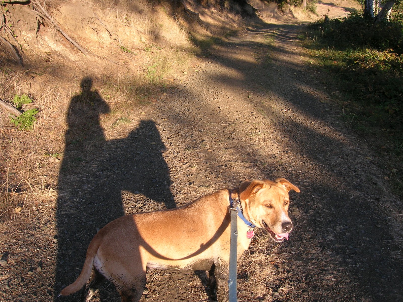 It was a lovely trail through the trees, along the creek, past skunk cabbage and ferns. But there wasn’t a soul around. We stepped over bear, cougar and deer droppings. Annie, who can’t resist a pond or a puddle, decided to cool herself in the muddy stream beside the road and emerged black from the belly down, as if she had stepped in paint. “Come on!” I urged. The sun, barely visible over the trees, dropped toward the horizon and shifted from in front of us to the side as we gradually left the creek behind. As we walked uphill and down, I started to worry. It was already 6:00. The sun would set in an hour. Where was the end of this trail? What if a bear came out of the trees? I started praying.
