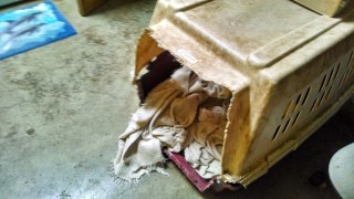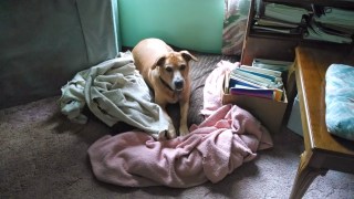 When I’m home, she now sleeps in the house, either on one of the big chairs or on her pink and white blankets on the floor. The laundry room was a good idea until the temperature dropped below freezing for weeks at a time, and the crate was just too big to bring into the house. The laundry room is only partially finished and gets almost as cold as outside, so I let her sleep inside. We tried sharing my bed, but we kept each other awake, so she sleeps in the living room, and I sleep in my room. But that beat-up crate is still there, just the way she likes it, stinky, messy, dark and private.