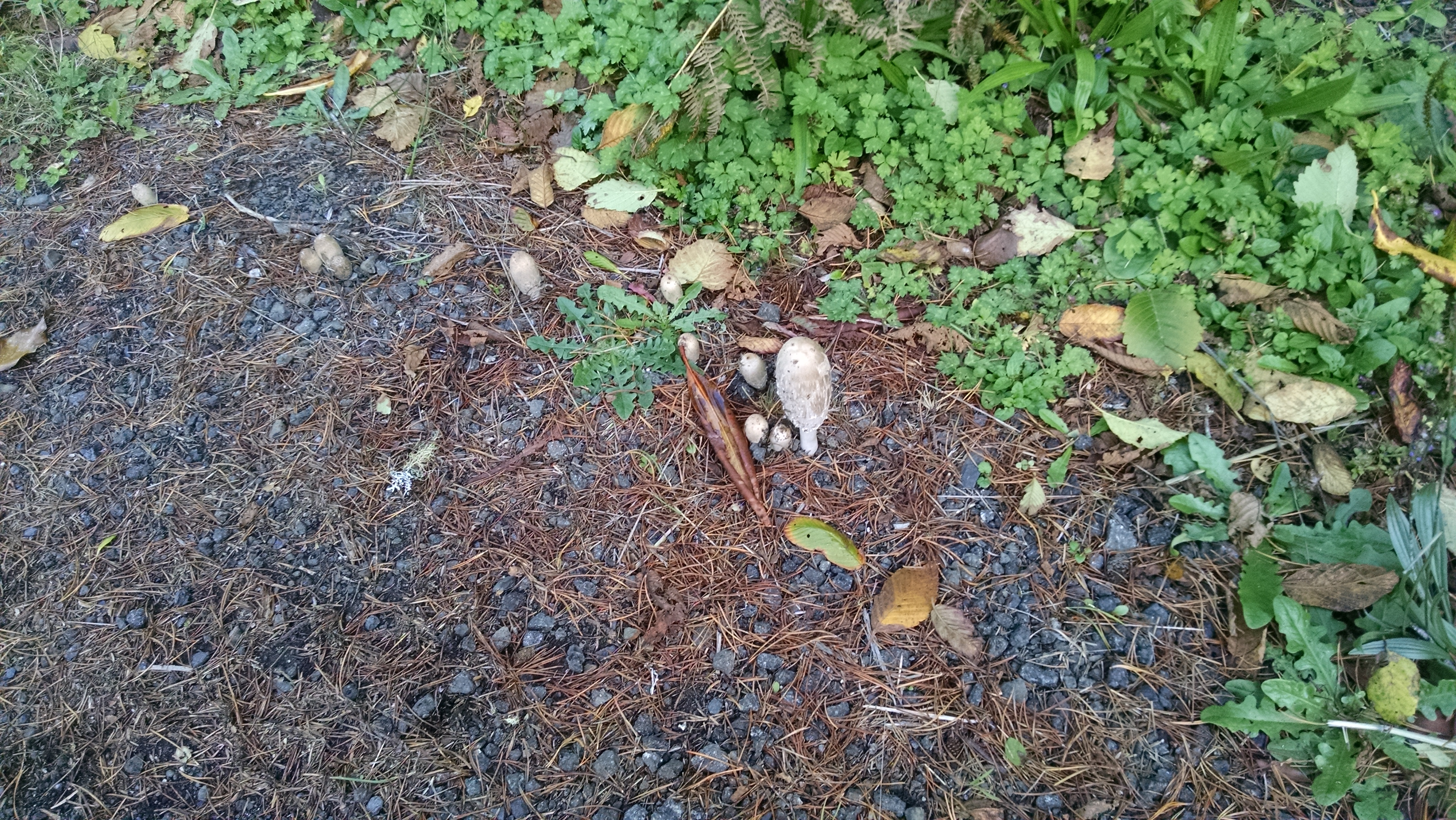 They started out as vertical white bulbs, a big one and several others in a row.On the second day, the big mushroom had opened and turned black and the little ones were opening like little black-rimmed umbrellas.On the fourth day, they were beginning to sag and one had fallen down. By the fifth day, all had fallen, their blooming over. What’s left has merged into the pine needles.