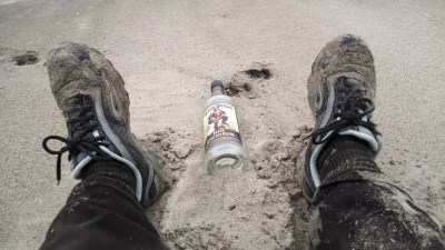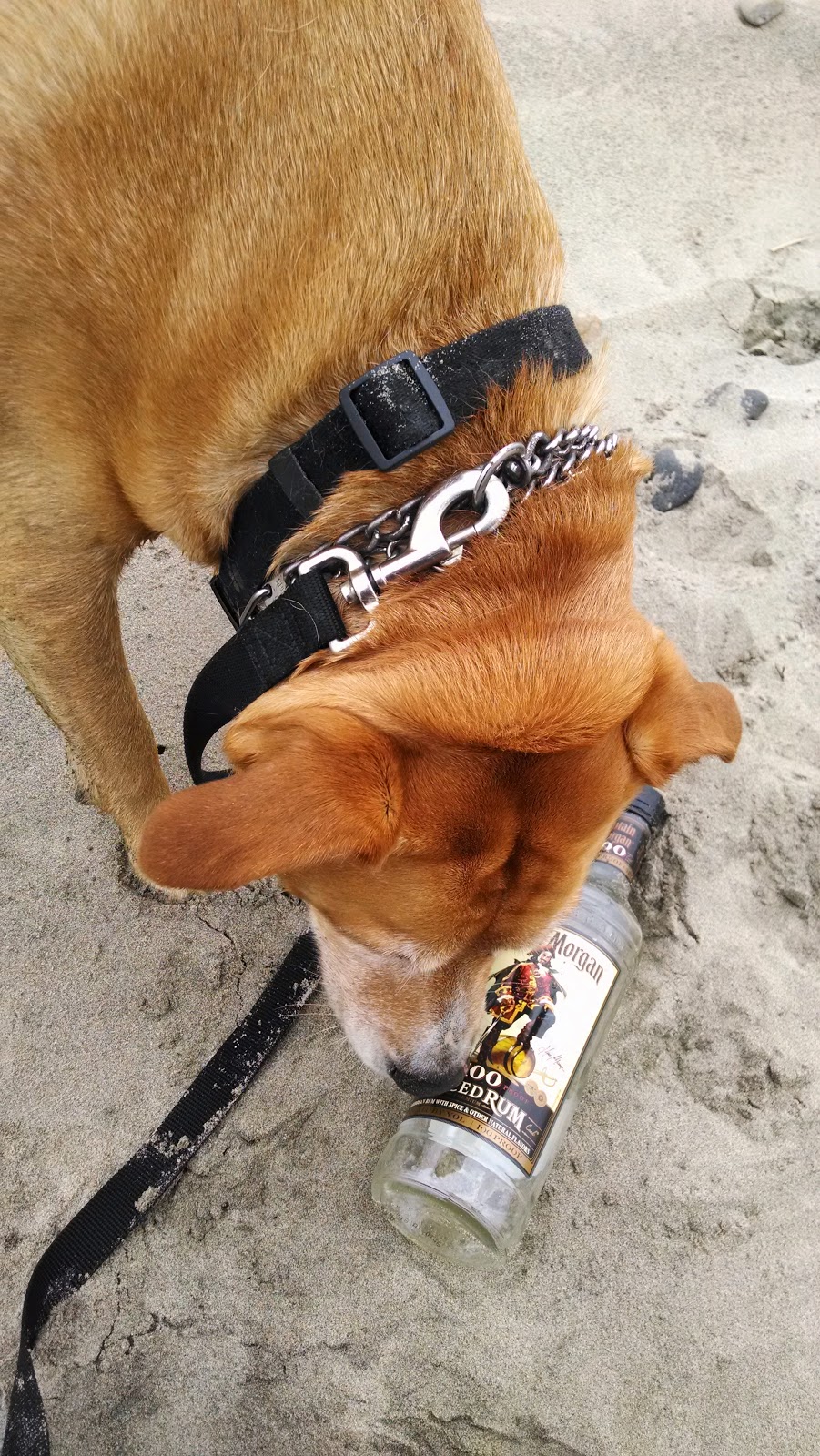 It’s a bottle. Captain Morgan Rum. Empty. It’s too clean to have been there more than 24 hours. I collapse on the sand with my dog, take pictures for fun with the rum bottle, read its label. Spiced rum. Best with Cola or straight, it says. I wonder who drank it, who left it here.