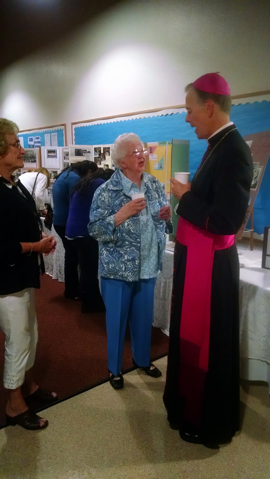 But the archbishop did not indulge. Instead he stood for over an hour as people lined up to meet him. He blessed the sick, listened to the stories of the old, young and in-between, and kidded the kids. In the picture above, he is talking to Rose Troxel, the church historian responsible for most of the photos and memorabilia on display behind them. Meanwhile, we all fell in love with the tall, handsome archbishop.