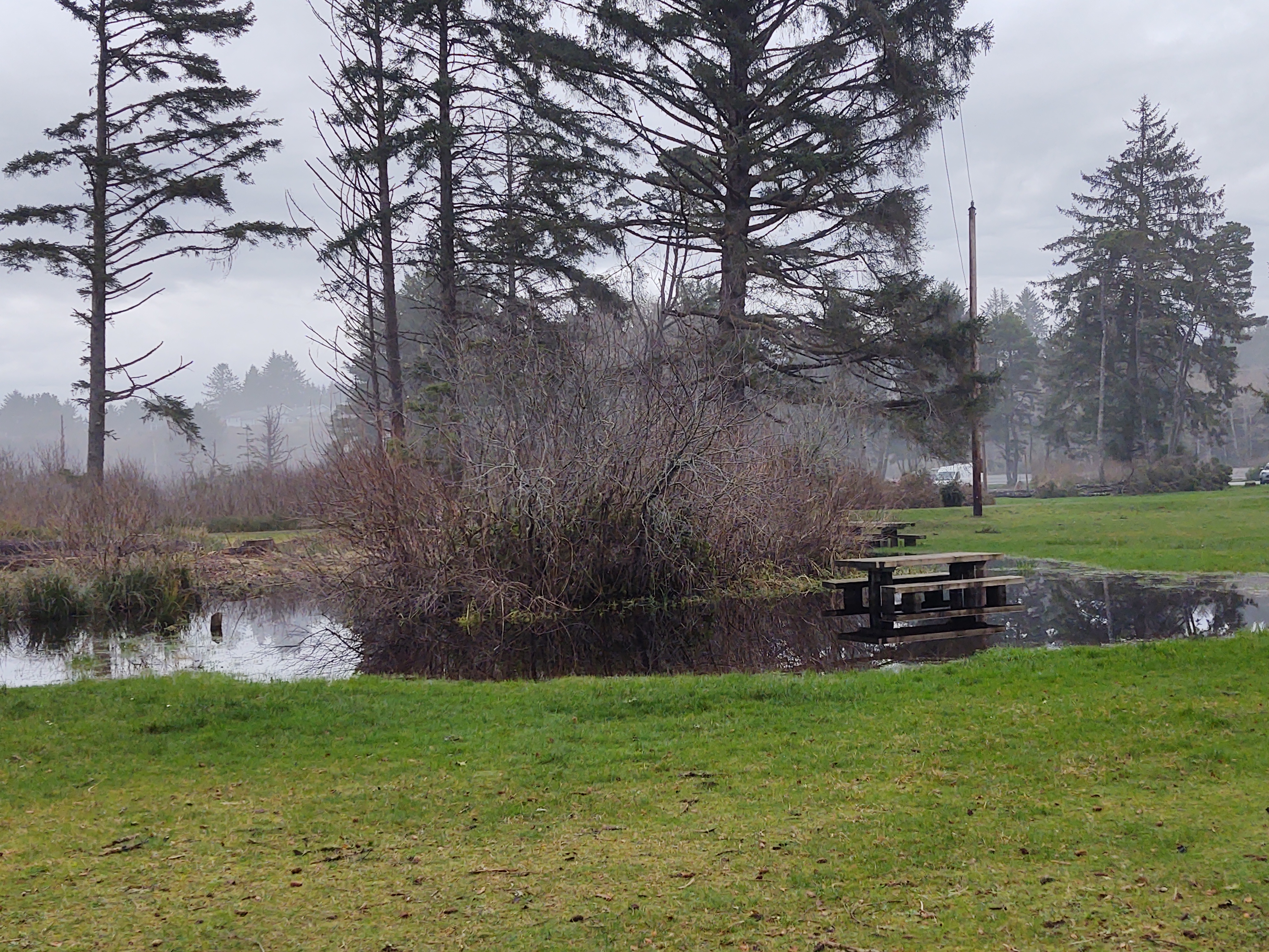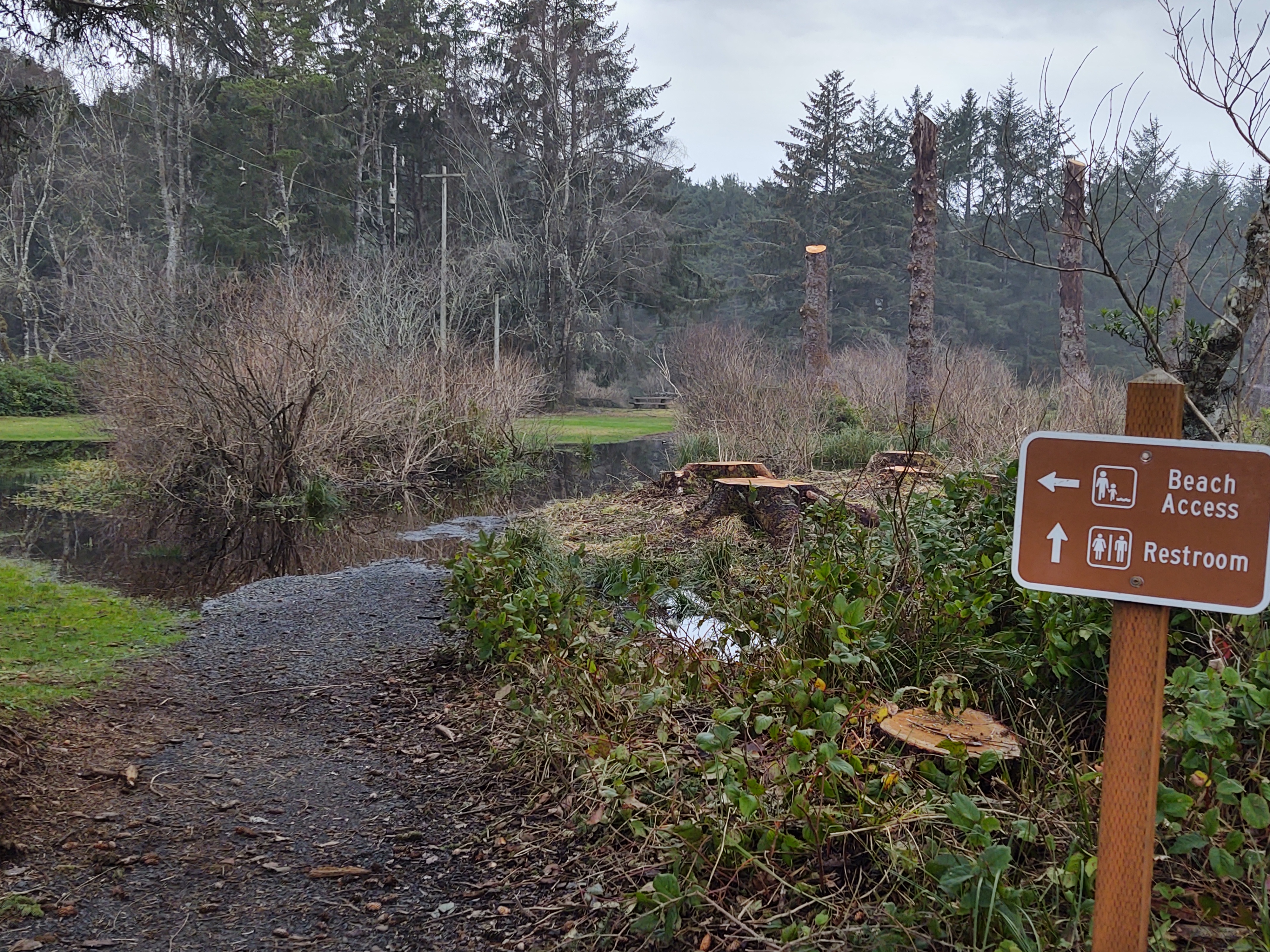 Ona Beach, about two miles south of where I live on the Oregon coast, was barely recognizable yesterday, with flooded trails, fallen trees, and other trees that had been chopped off up high so they looked telephone poles or maybe totem poles.